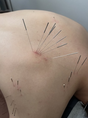 上の写真は、肩甲骨と肩甲骨の間、いわゆる肩甲間部の痛みを訴えて来院された方に対する鍼治療の様子です。
