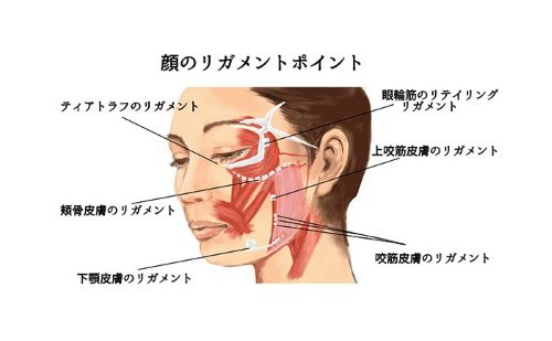 リガメントとは、骨と皮膚・筋肉をつなぎ、顔の位置を固定・支持している靭帯のこと。