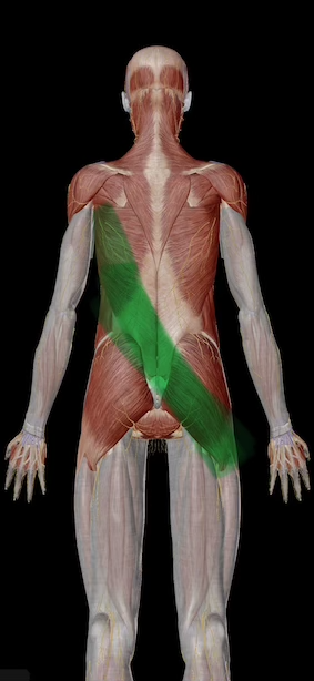 筋膜のつながりとしては「背中〜腰〜反対側の殿部〜太もも外側」まで、