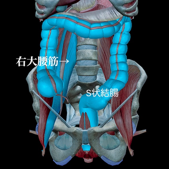 【向かって左側、右大腰筋の向かいに左の大腰筋があり、S状結腸と近接しているのがわかります。】